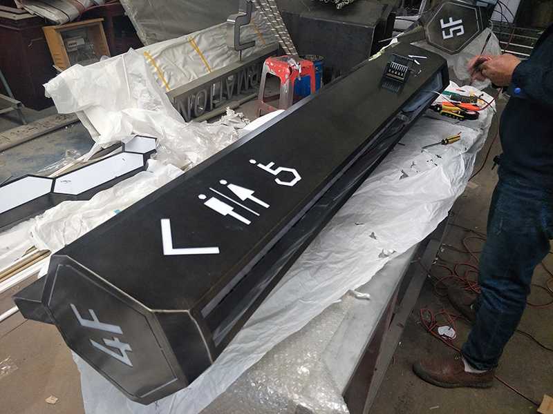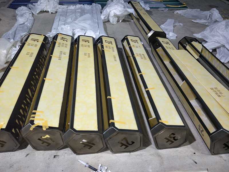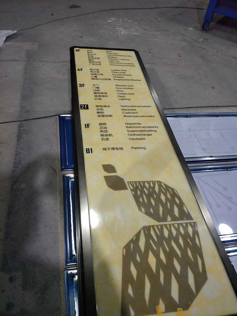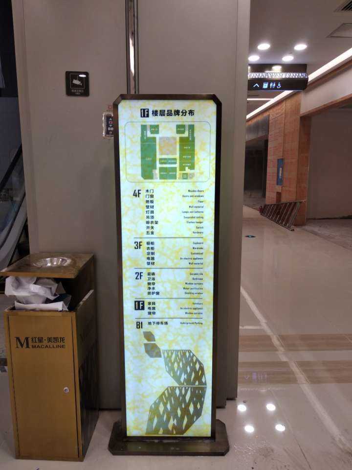 本批次產品均由不銹鋼折彎焊接成型, 表面采用電鍍上色,吊牌內容鏤空,內襯亞克力,LED發光。整體從內部機構到外表造型及顏色均滿足紅星美凱龍總部要求的VI標準,與商場環境和風格相互融合,滿足導視功能的同時融入環境,增強視覺美感。